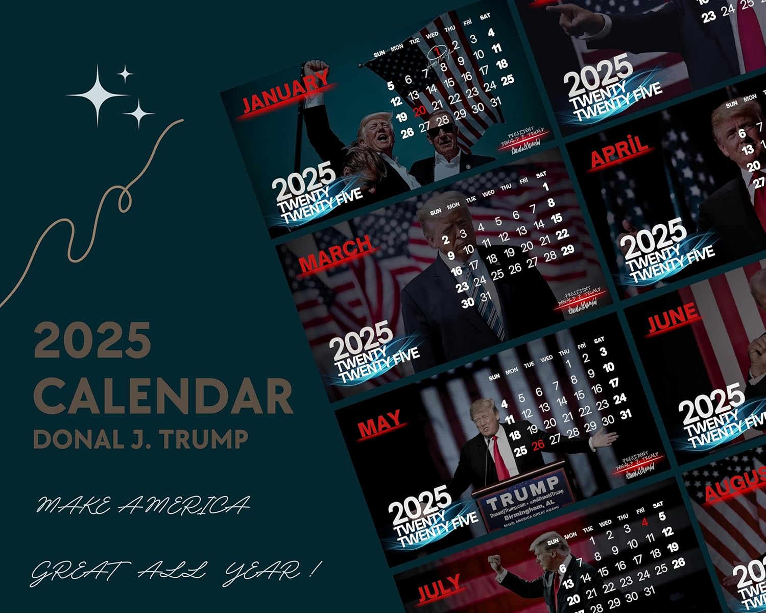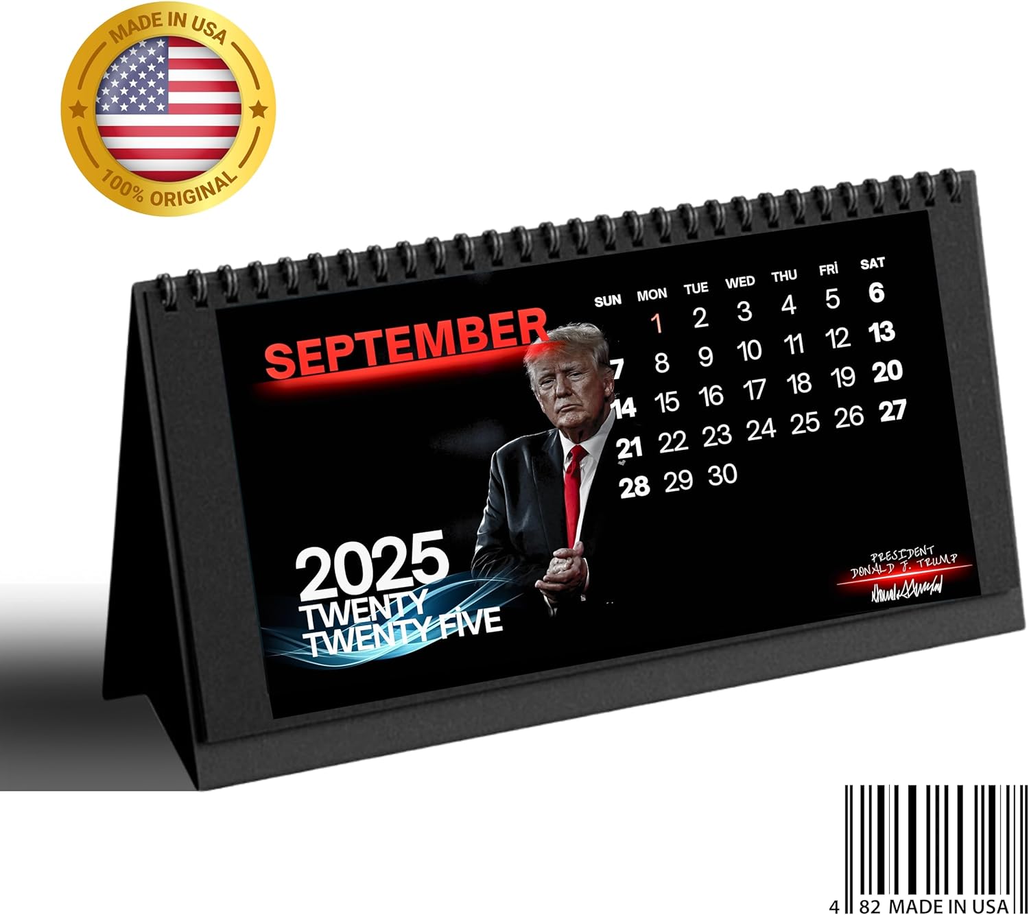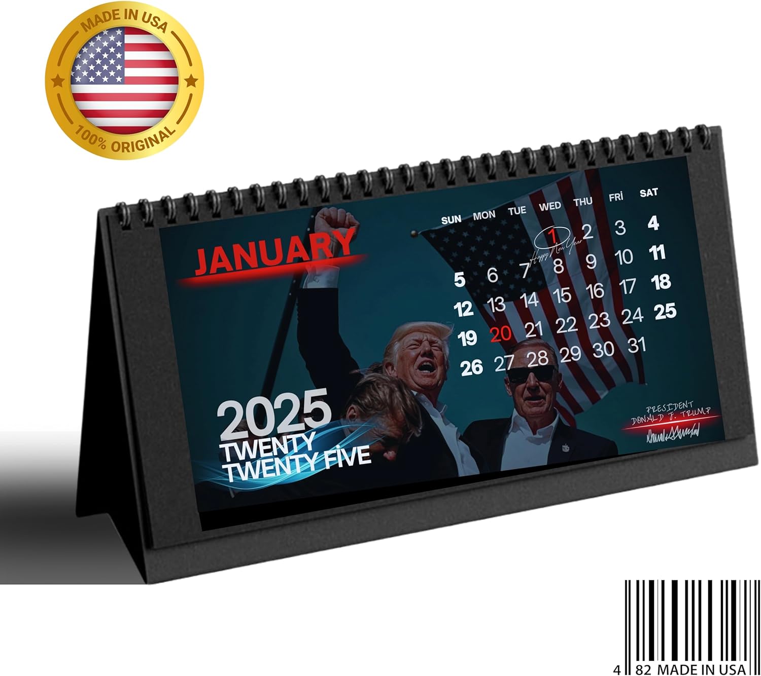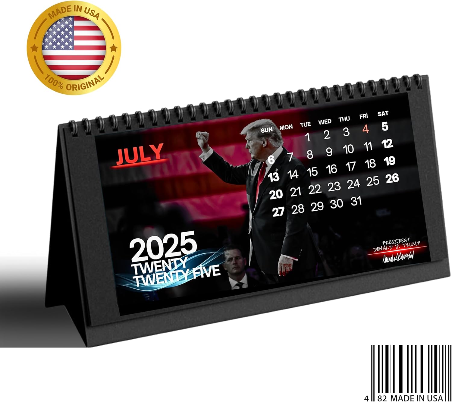 Start each day with inspiration from one of America’s most iconic figures. This 2025 Desk Calendar brings together powerful quotes, captivating images. Crafted in the USA, this calendar is both a practical desk accessory and a memorable gift. Each month presents a unique image and quote from Trump, designed to keep you motivated and remind you of American pride. Ideal for home or office, this calendar is a must-have for Trump supporters and a great conversation starter. Order now and make every day of 2025 a tribute to America!