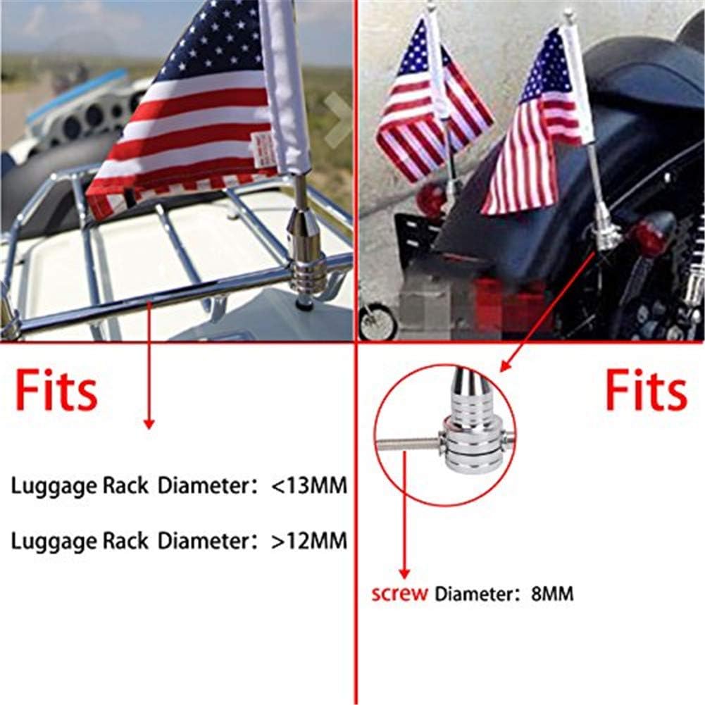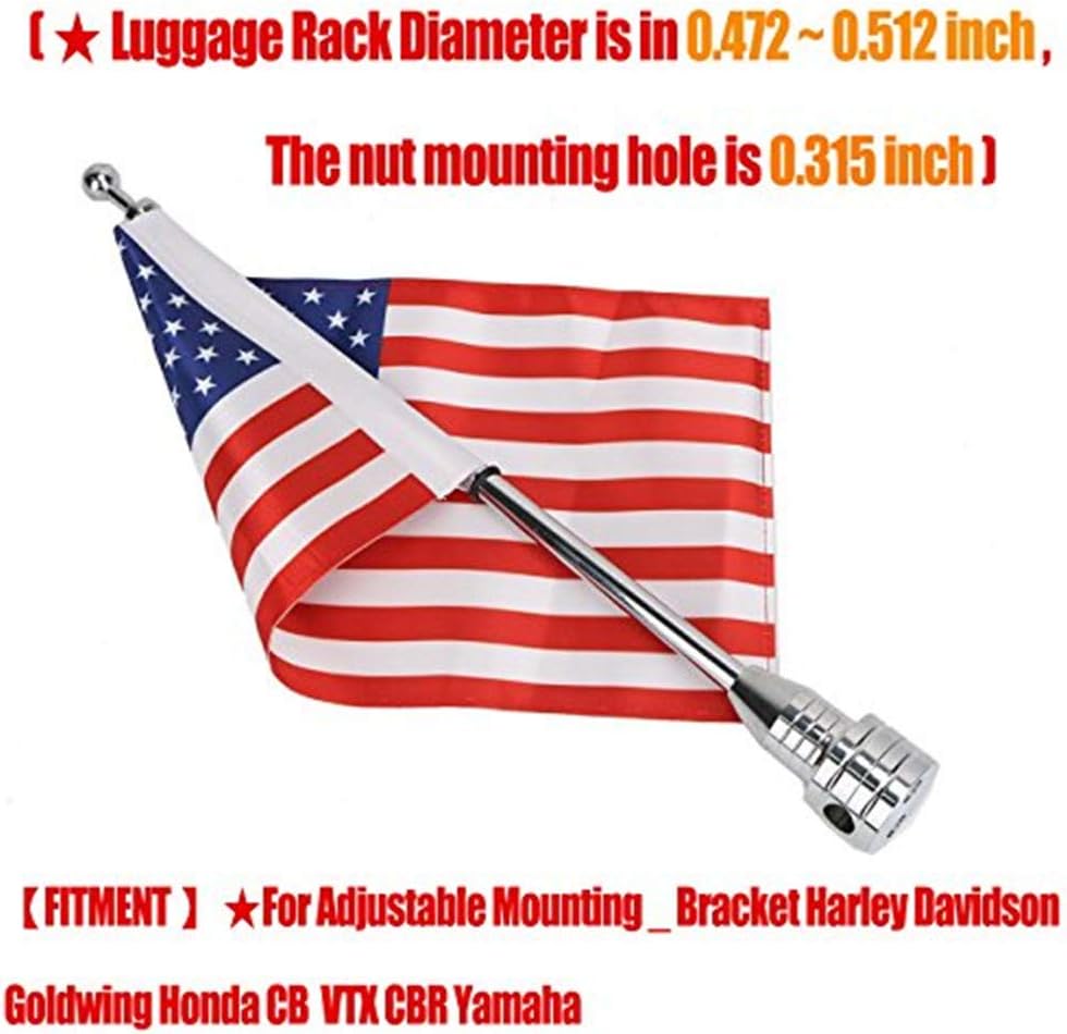 Motocycle Flagpole Fitment: For Adjustable Mounting Bracket Goldwing Honda CB VTX CBR Yamaha ( Luggage Racks Diameter is in 0.472 ~ 0.512 inch ; The Rear Fender Nut mounting hole is 0.315 inch )