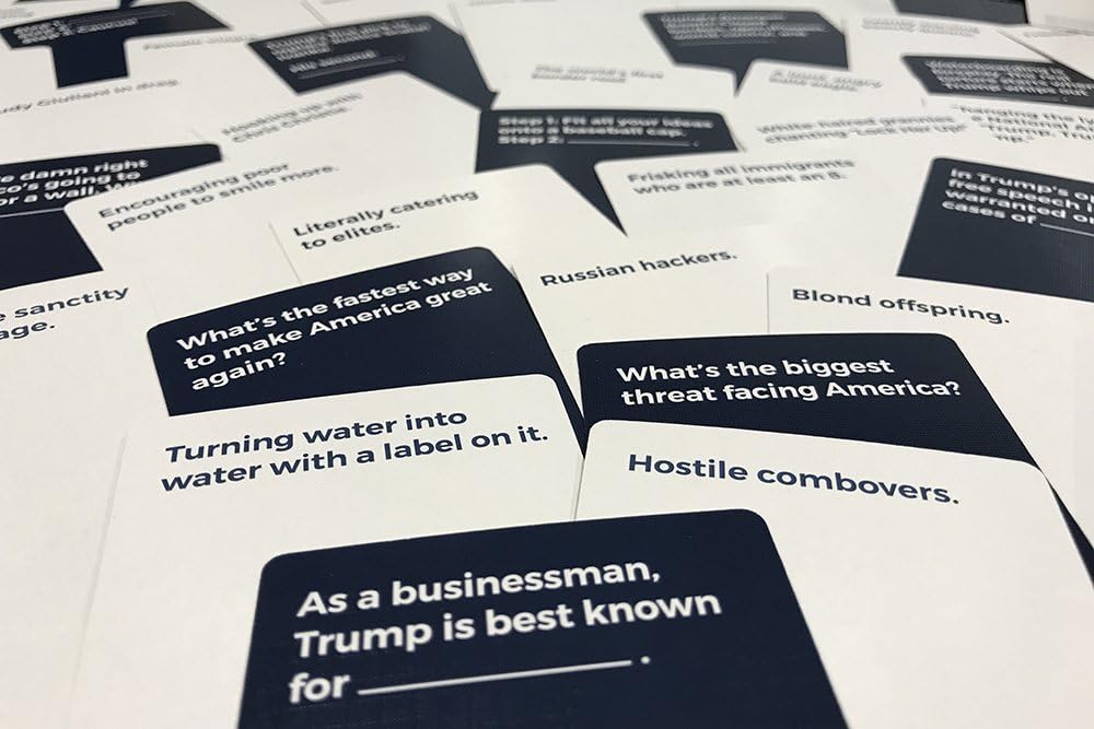 Trumped Up Cards is so, so easy to play! Every round, players use their White answer cards to respond to a Blue question card. The best response wins the round. Then, the process repeats itself, until the player with the biggest brain and the most strength and stamina wins the game. No recounts allowed!