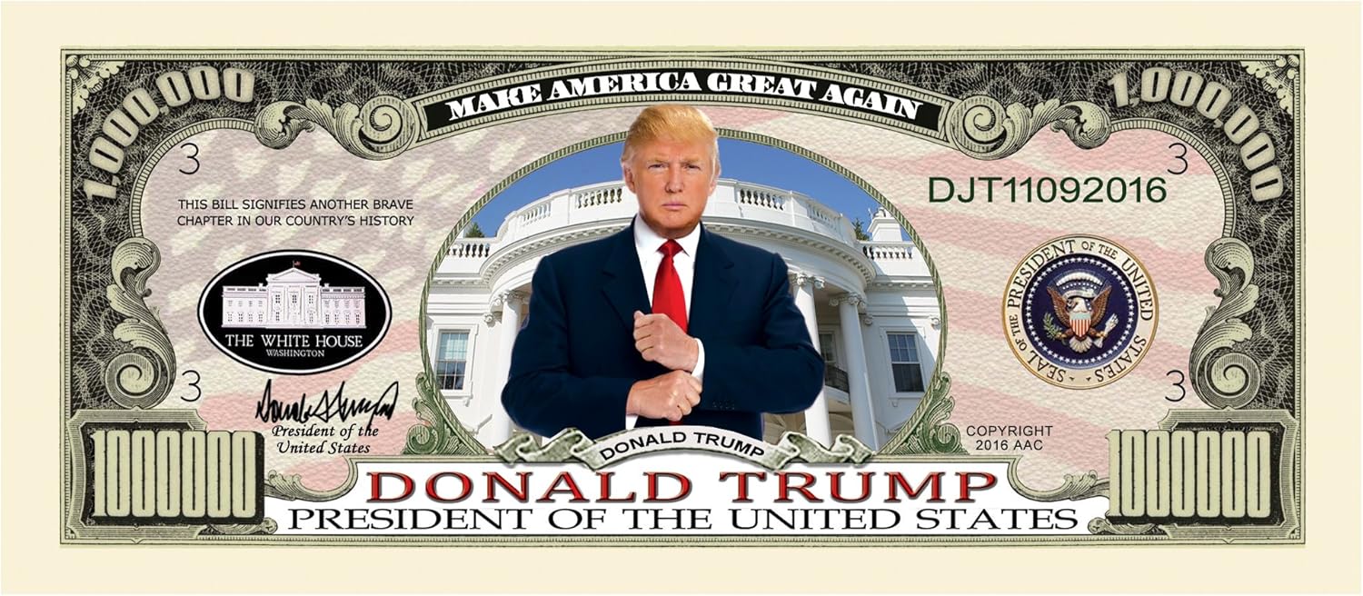 * Donald Trump Legacy Million Dollar Limited Edition Bill – Highly Collectible Novelty Dollar Bill – Funny for Democrats or Republicans – Funniest Political Gift* SAME LOOK, FEEL AND SIZE as real US money currency.* GREAT GIFTS for friends or family* FULL COLOR FRONT AND BACK PRINTING with great detail.* MADE IN THE USA