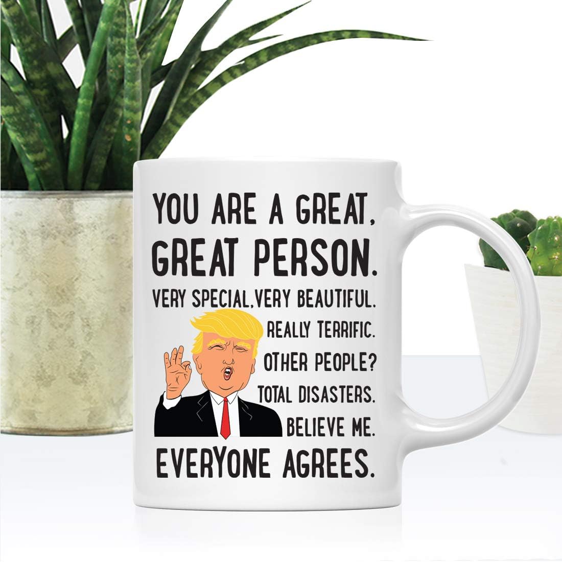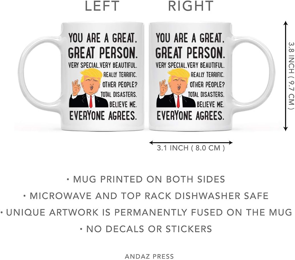 Humorous Trump Novelty Mugs Design: This trump funny novelty mug features humorous printed text, “You Are A Great, Great Person, Very Special, Very Beautiful, Really Terrific. Other People?”; fits in collections of trump coffee cups and sarcastic novelty items; can be gifted as funny trump gifts at parties or dinners; pairs well with other trump great friend mug options; also suits fans of donald trump merchandise for men or women looking for political conversation pieces