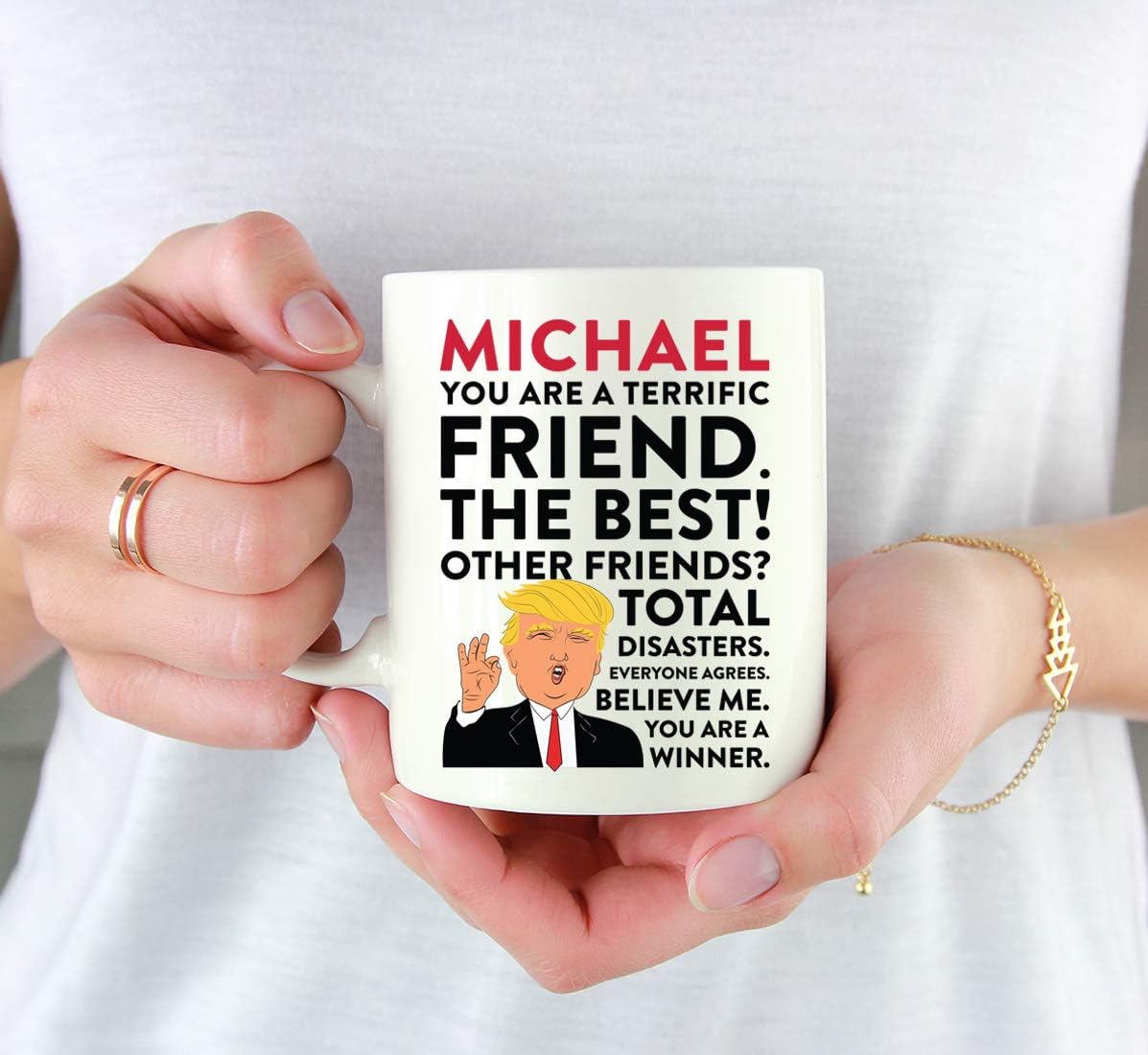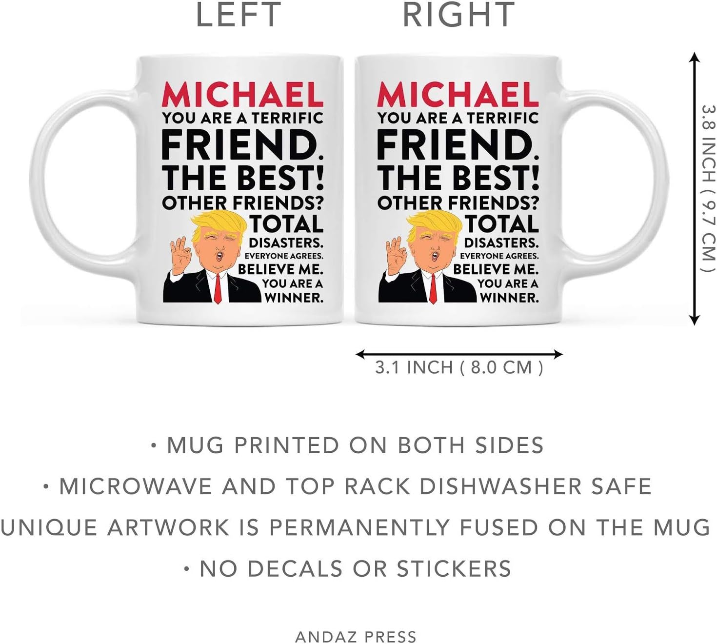 INCLUDES: 1 coffee mug with gift box. This 11 ounces donald trump friend mug is practically sized for coffee or tea and includes a reliable handle for everyday use; designed to be shared as a humorous personalized trump mug friend with name customization; a reliable trump friend gift to use at home or the office; this trump best friend cup mug fits comfortably into novelty collections; a thoughtful trump great friend mug to use or display; designed on a white custom trump mug base