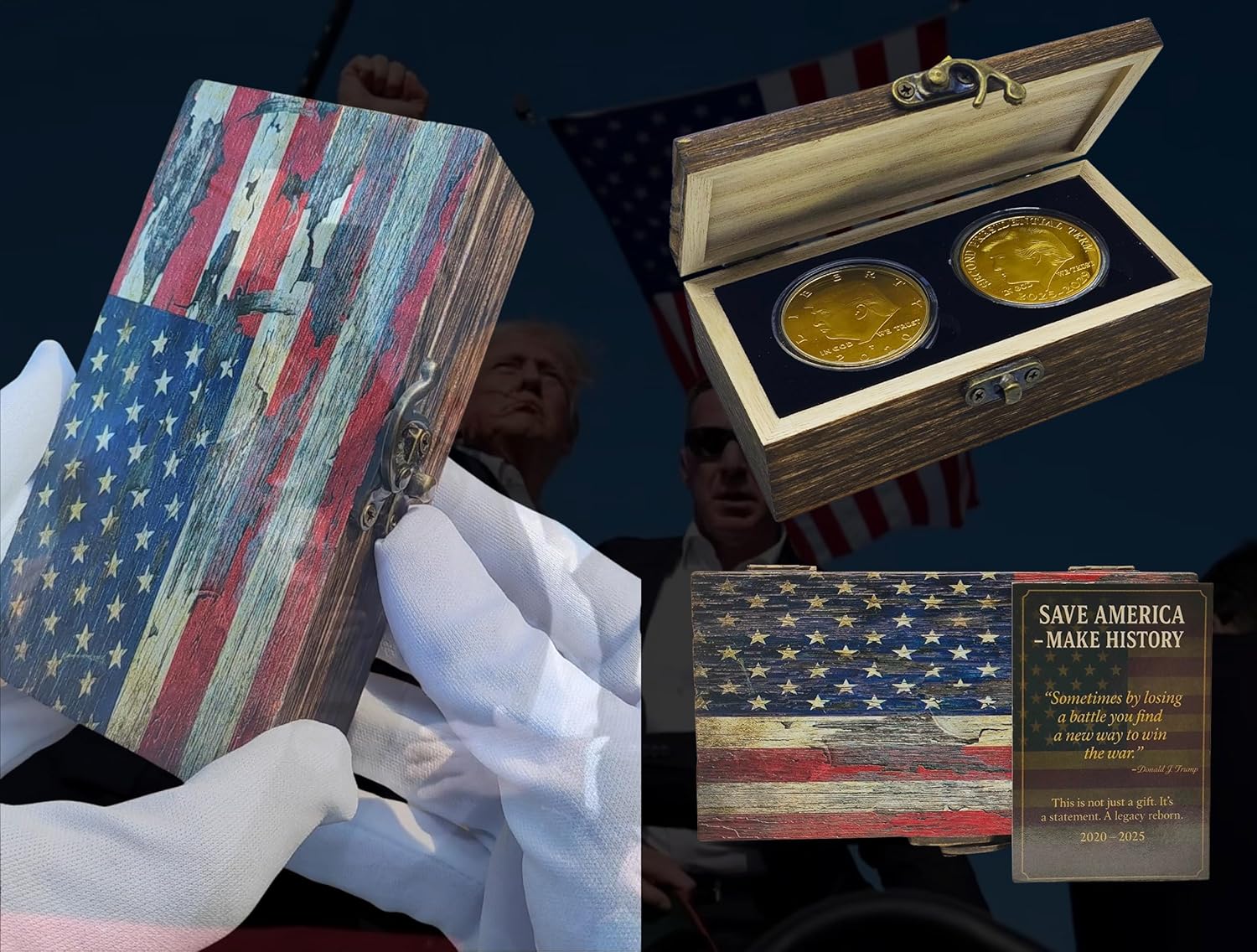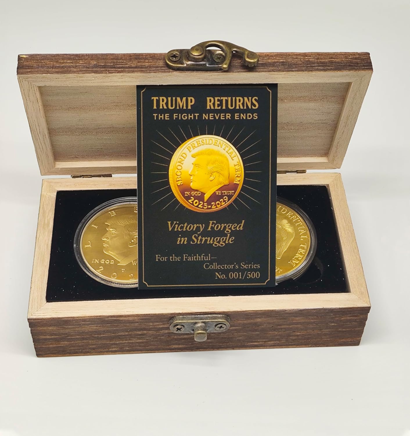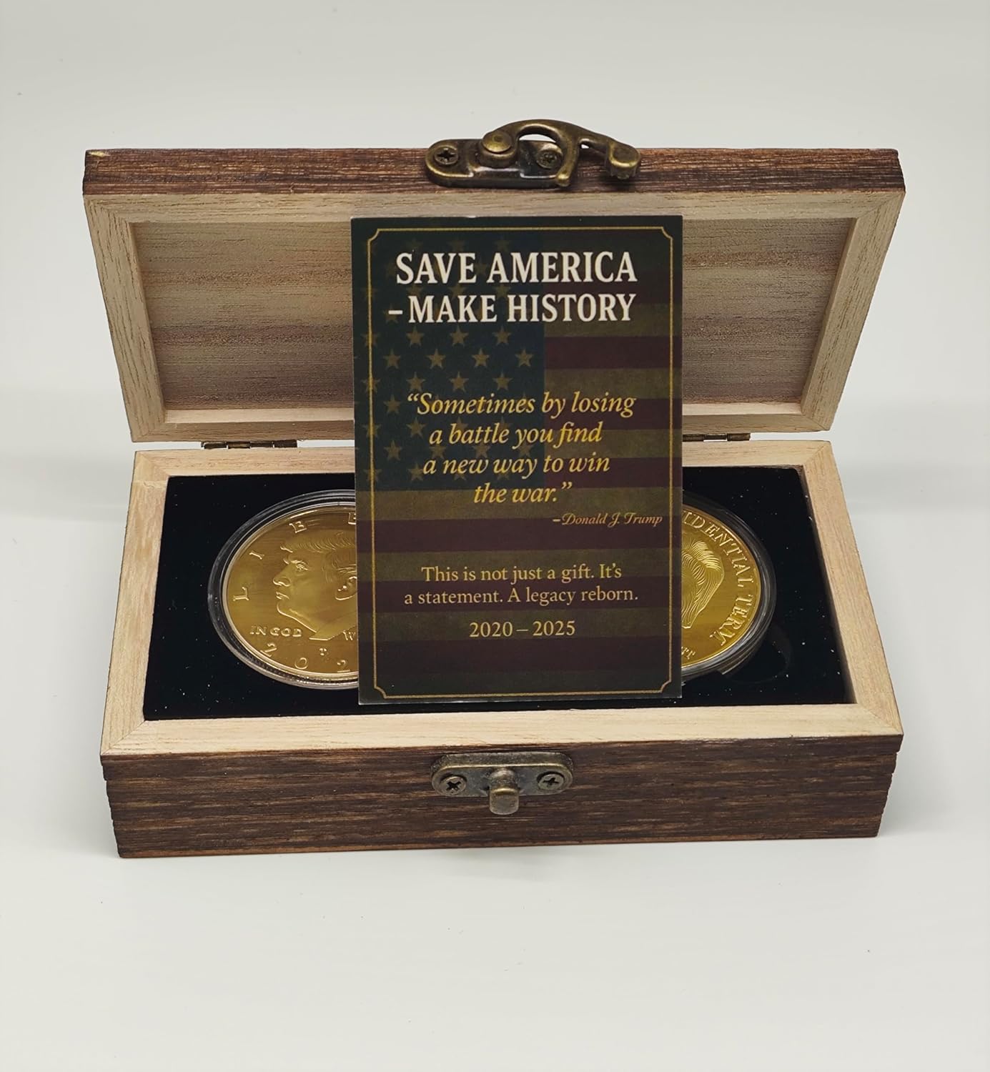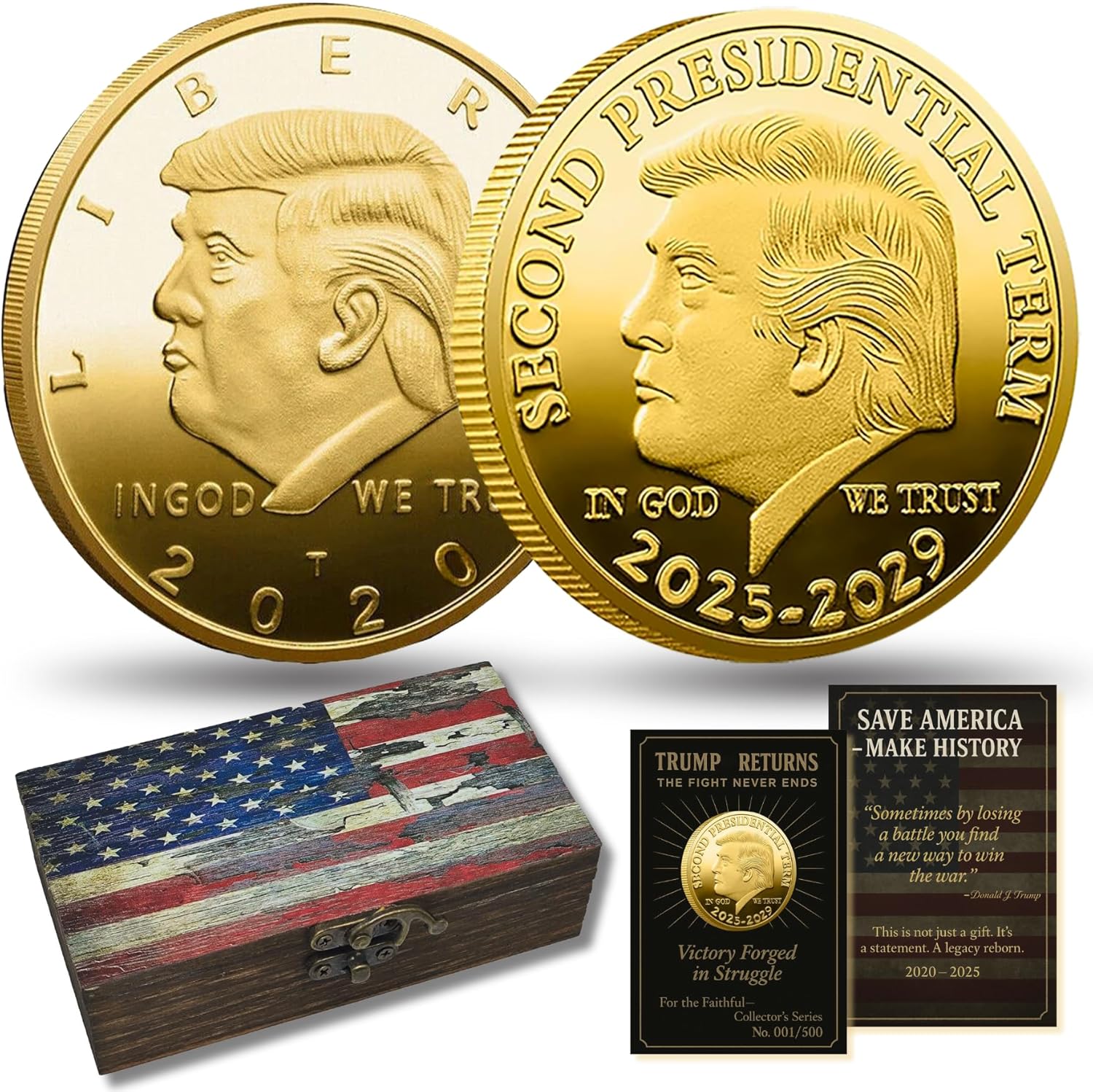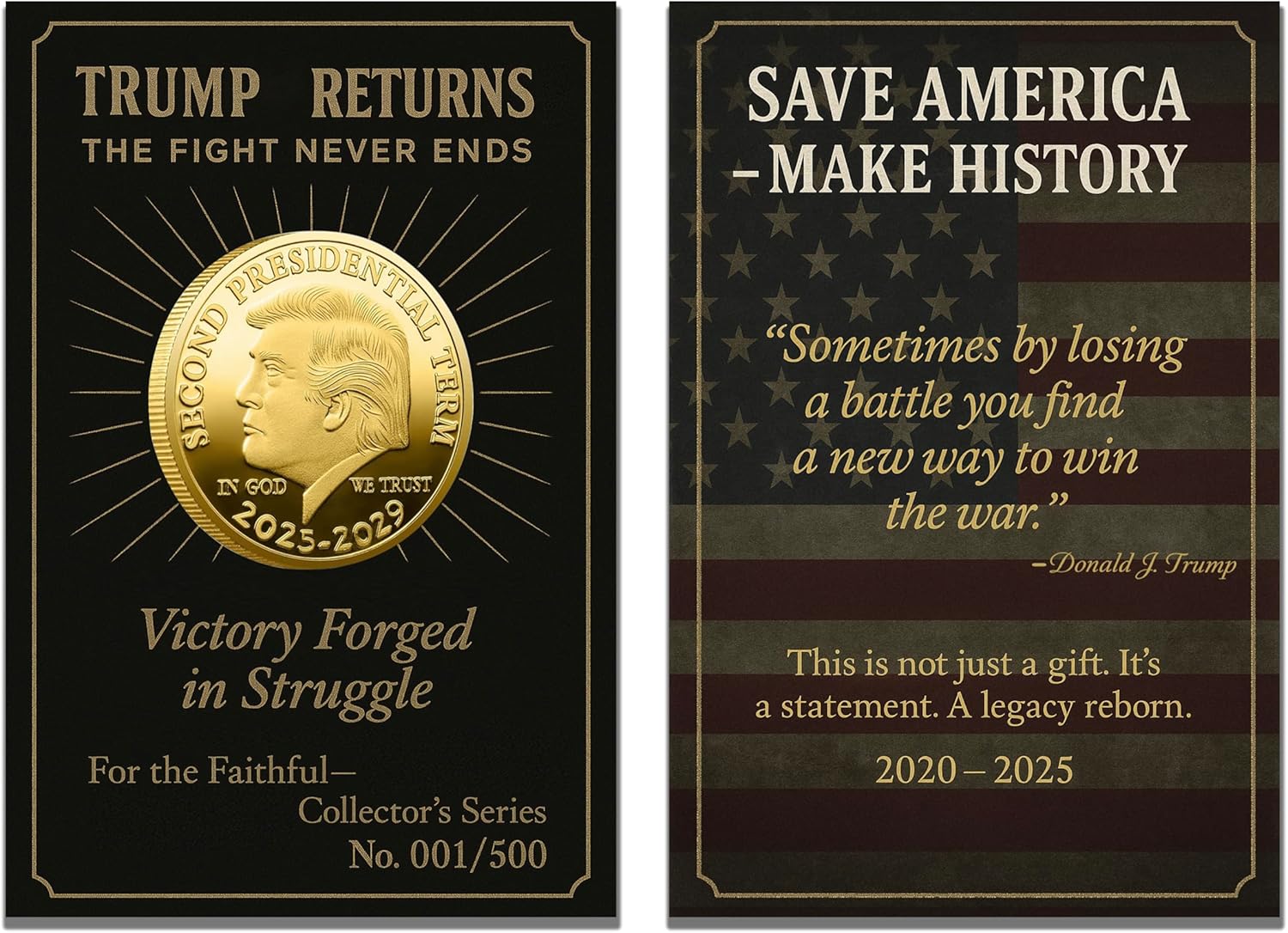 TWO COINS – ONE LEGENDARY COMEBACK. From 2020 to the victorious return of 2025–2029, these two premium coins capture a historic fight—and a second term forged in fire. A tribute to the greatest political comeback in modern U.S. history. You’re not buying coins—you’re owning a legacy.