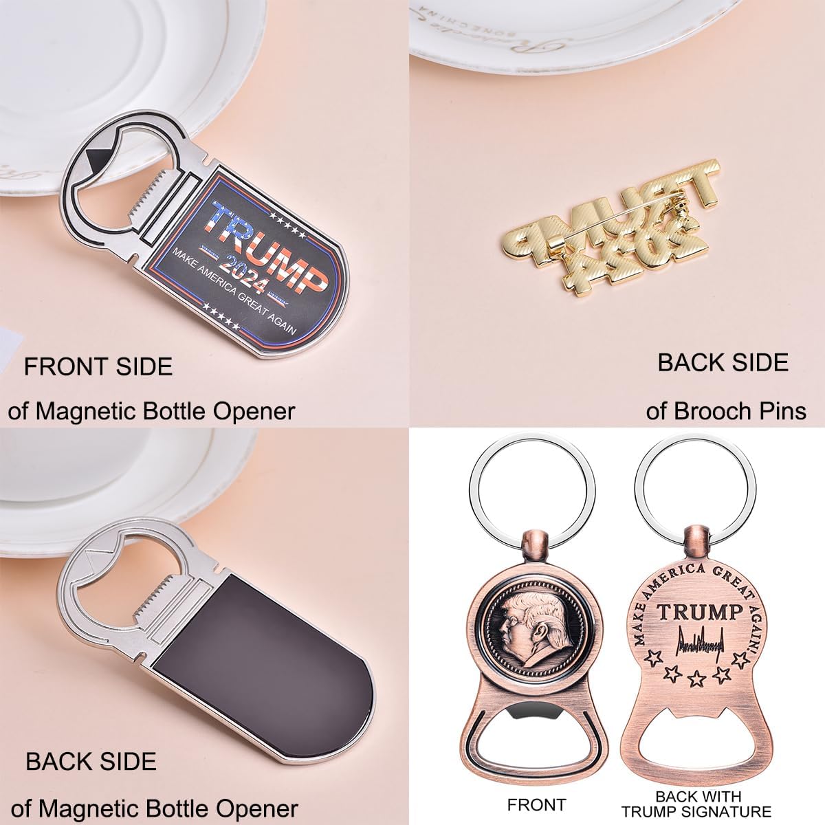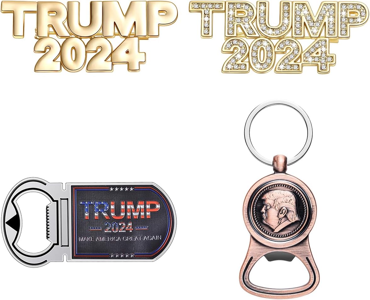 #1 Donald Trump Gifts 2024 for Trump Supporters and Patriotic Americans: pack of 1 lapel brooch pin with crystal stones, 1 lapel brooch pin without crystal stones, 1 Trump 2024 Make America Great Again keychain bottle opener, 1 Trump 2024 Make America Great Again magnetic bottle opener.