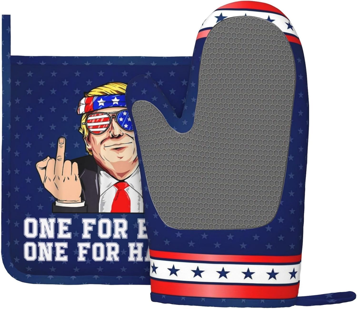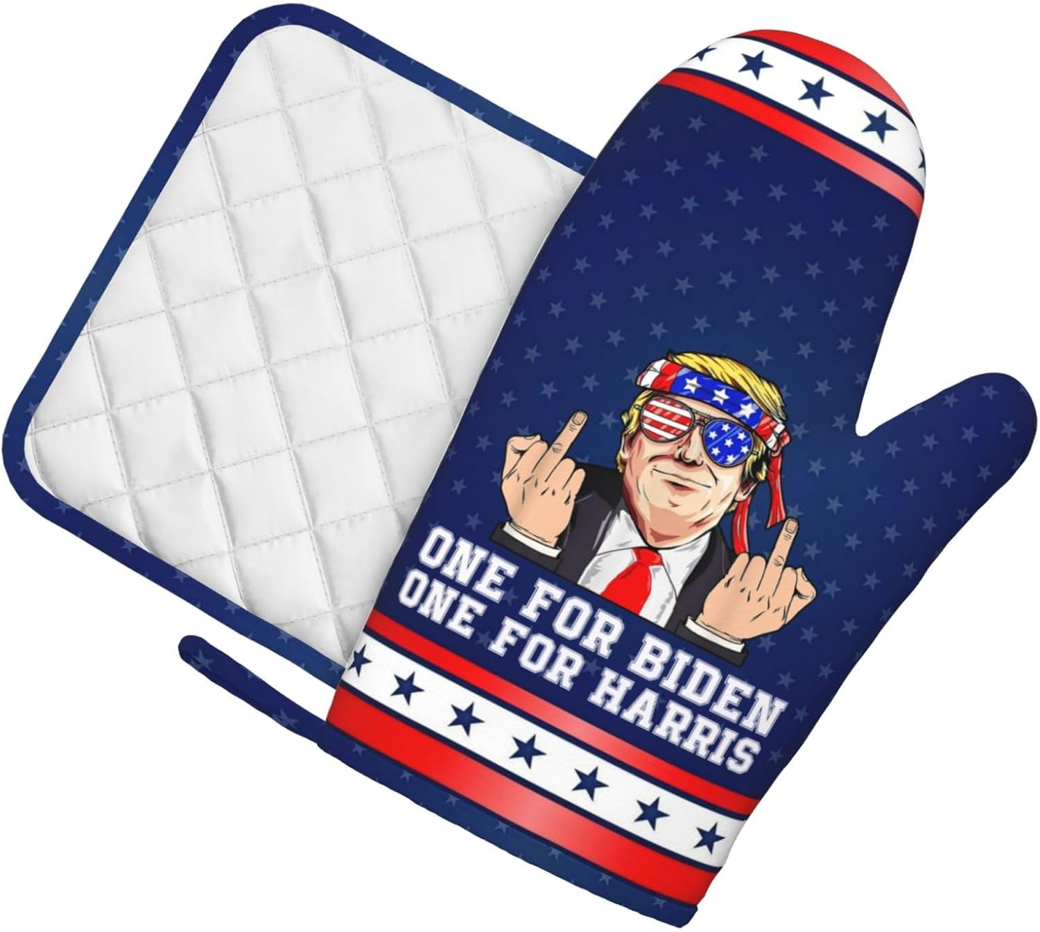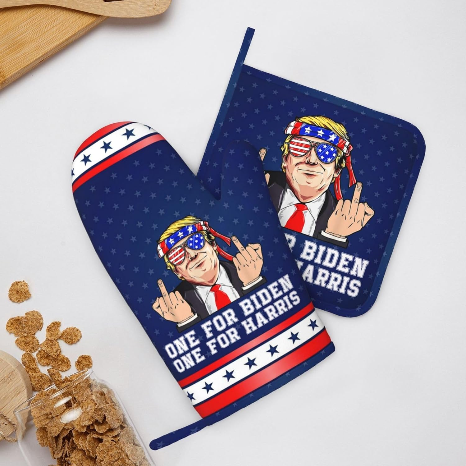 Donald Trump Middle Finger Biden Harris America Republican Gifts Oven Mits/Glove Set: 1 oven mitts (7x11in) and 1 pot holders (8x8in), fit for any hand. Necessary kitchen gadgets or accessories. They all come with hanging loops for easy storage after daily use, saving space and making the kitchen look cleaner.