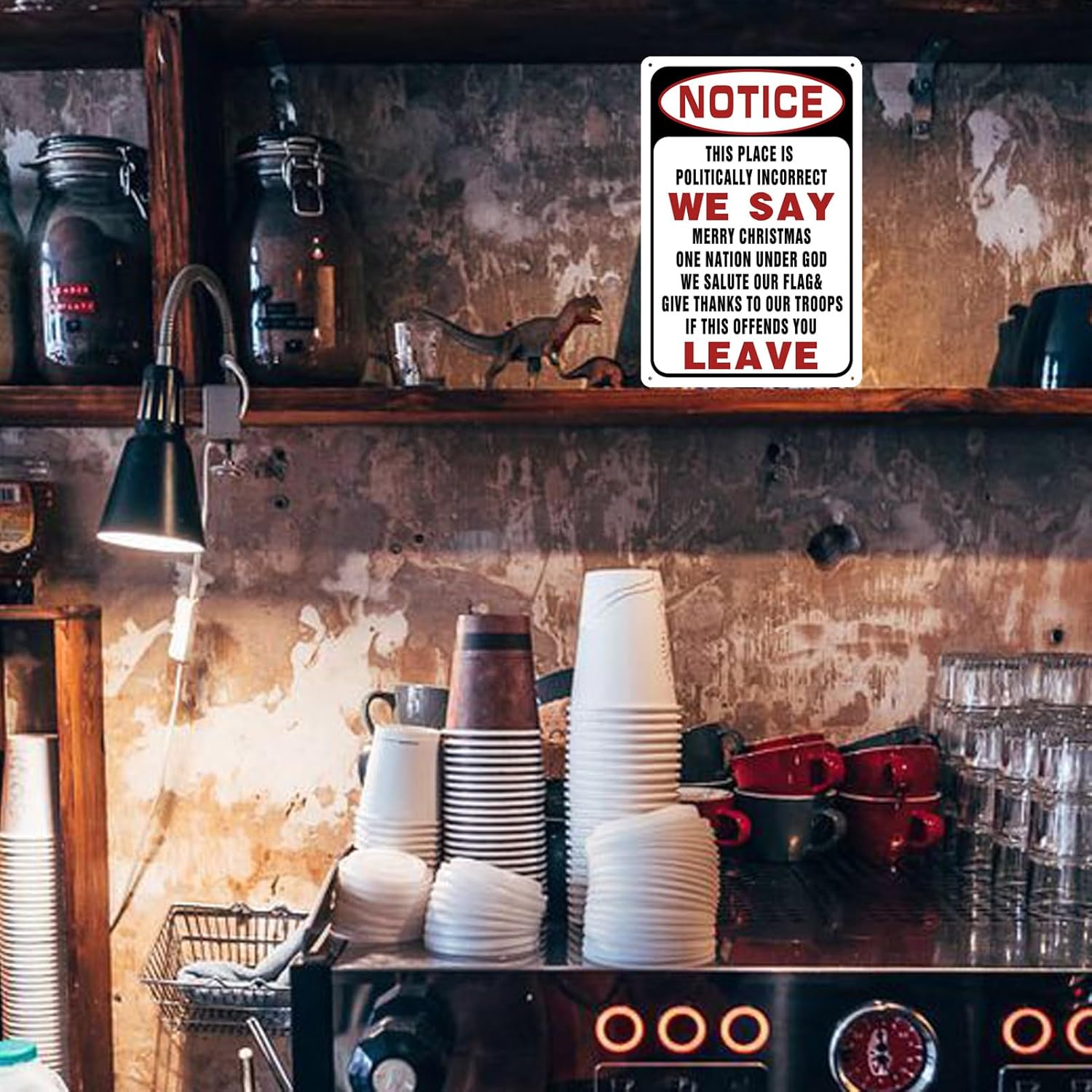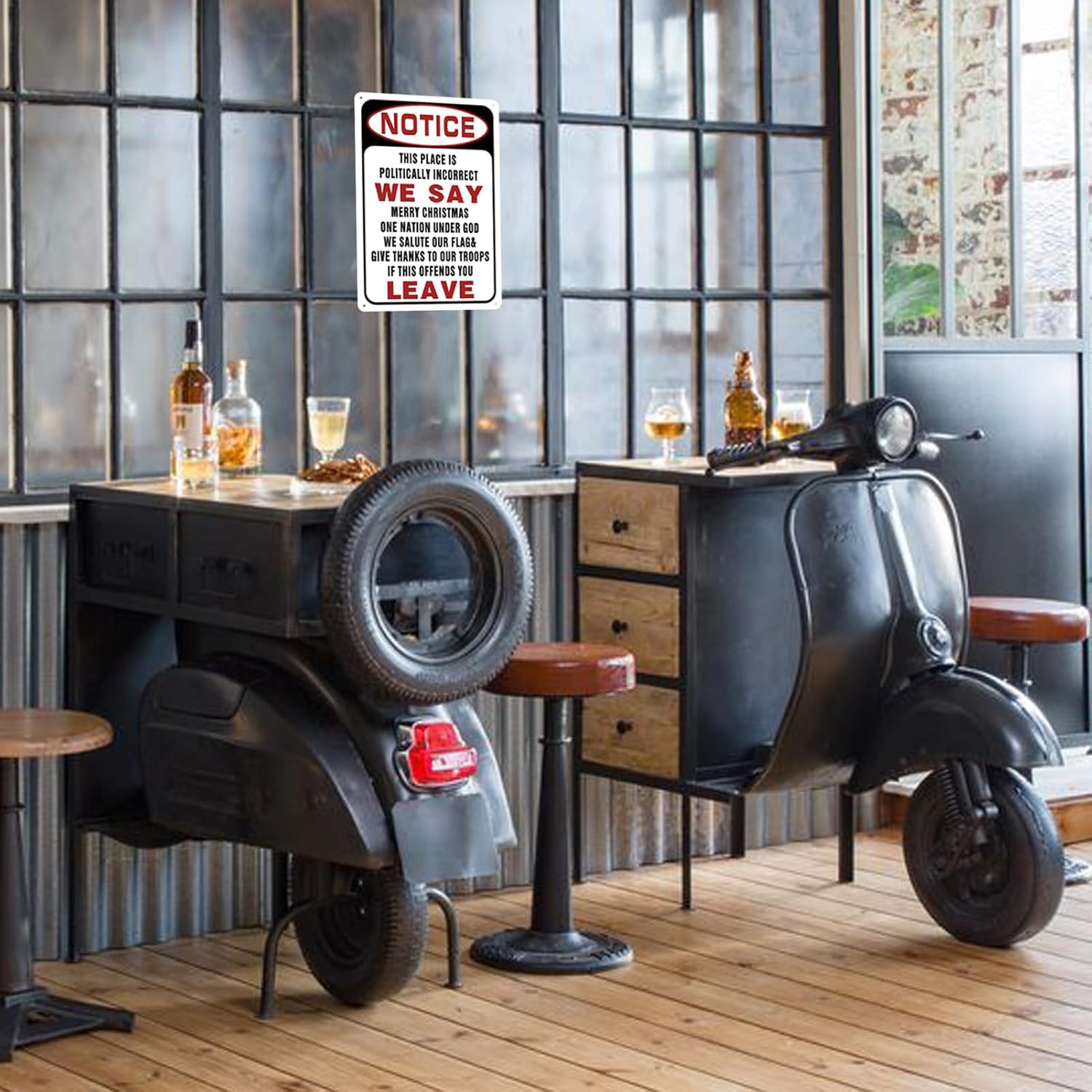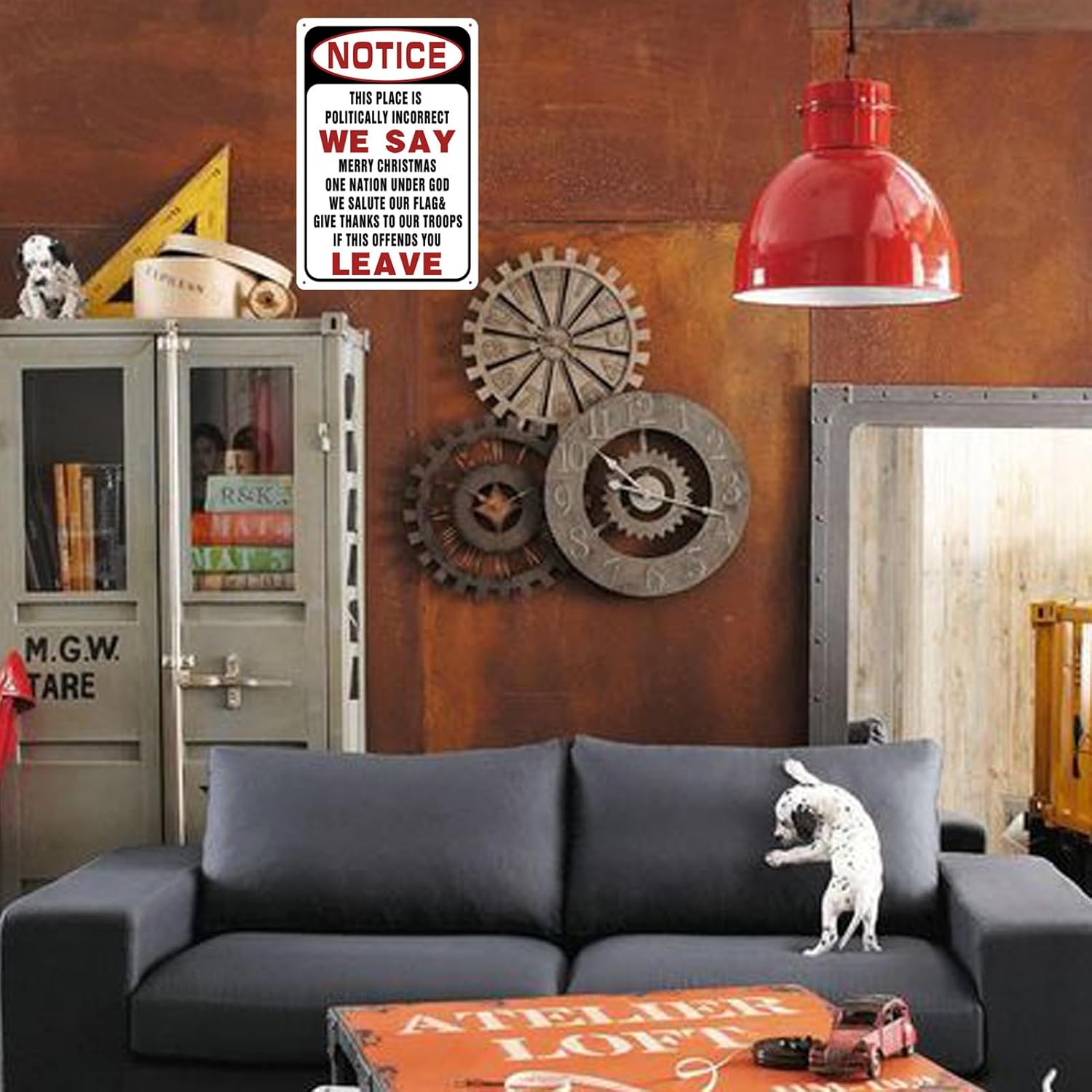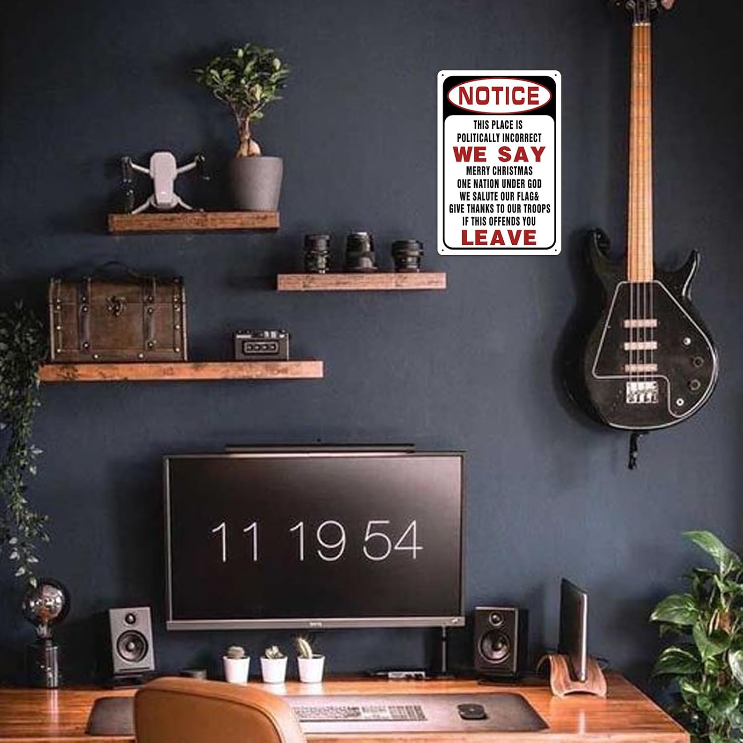 Interesting Gift: Garage signs for men printed: “NOTICE THIS PLACE IS POLITICALLY INCORRECT WE SAY LEAVE”. A truly original and unique gift filled with your sincere love that will bring a smile to everyone’s face.