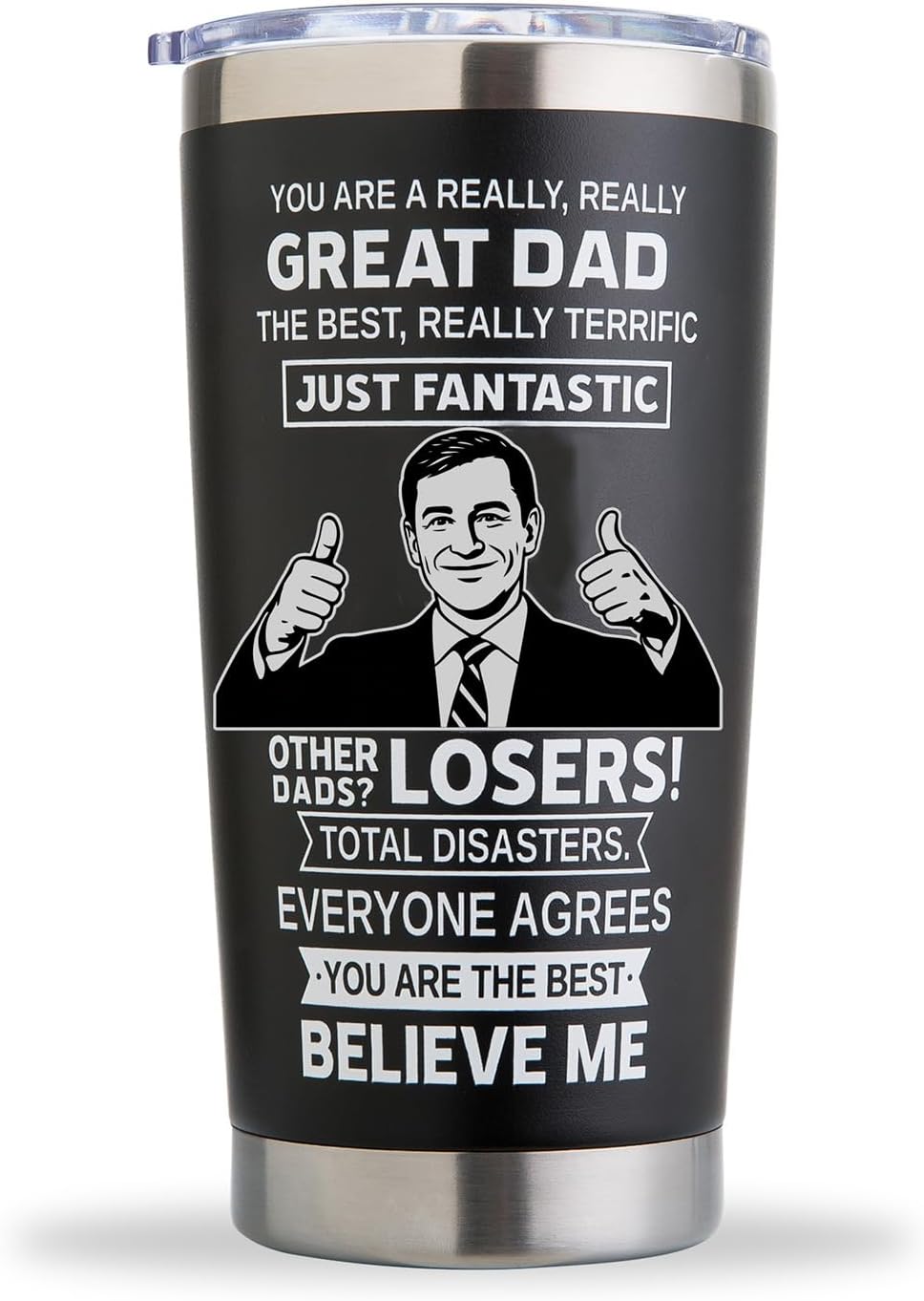 Customers find the tumbler keeps drinks warm for a long time and appreciate its high quality construction. The cup is well-sized and serves as a great gift, with one customer noting that the lid seals tightly without leaks. They enjoy its humor, and one mentions it’s particularly suitable for coffee-drinking dads.
