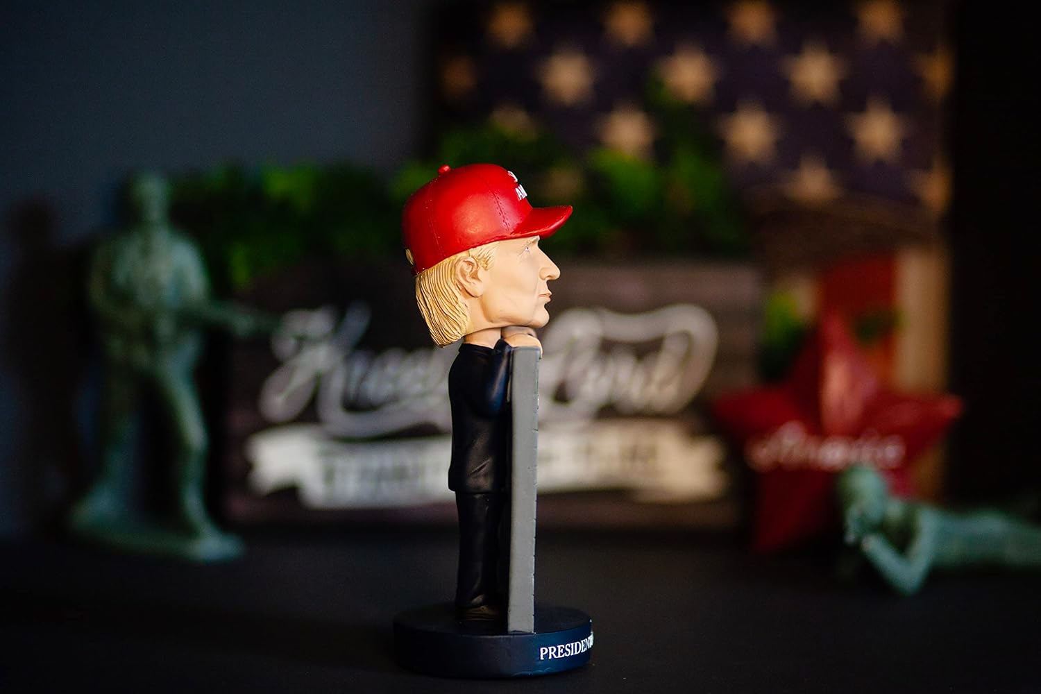 𝗘𝘅𝗰𝗲𝗽𝘁𝗶𝗼𝗻𝗮𝗹 𝗛𝗮𝗻𝗱-𝗣𝗮𝗶𝗻𝘁𝗲𝗱 𝗗𝗲𝘁𝗮𝗶𝗹: This donald-t bobble head is crafted from premium resin, showcasing intricate hand-painted details, including his signature red hat and the USA flag. The “Keep America Great” slogan across the front makes it a standout collectible, perfectly capturing his iconic style and adding a bold statement to any display.