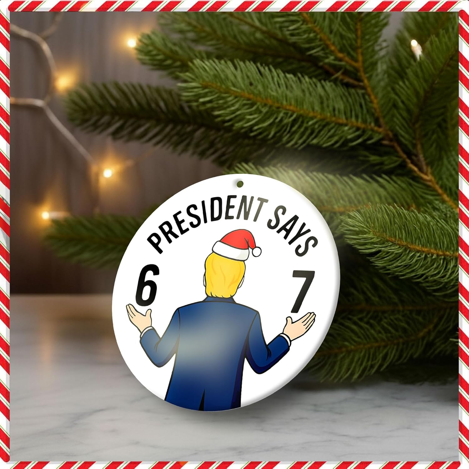President Says 6 7 Ornament – Funny Political Meme Christmas Ornament 2025, Double-Sided Acrylic Decoration, Hilarious Ornament Exchange Gift for Adults & Teens, Patriotic Stocking Stuffer