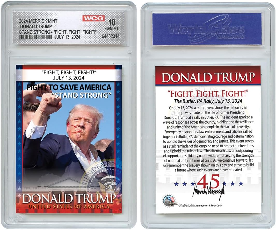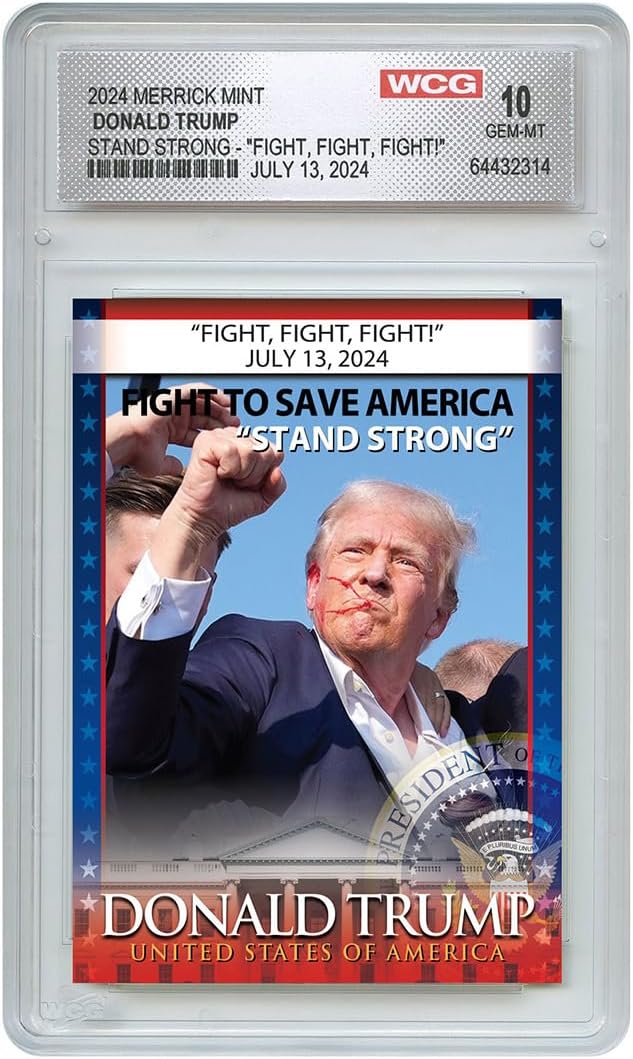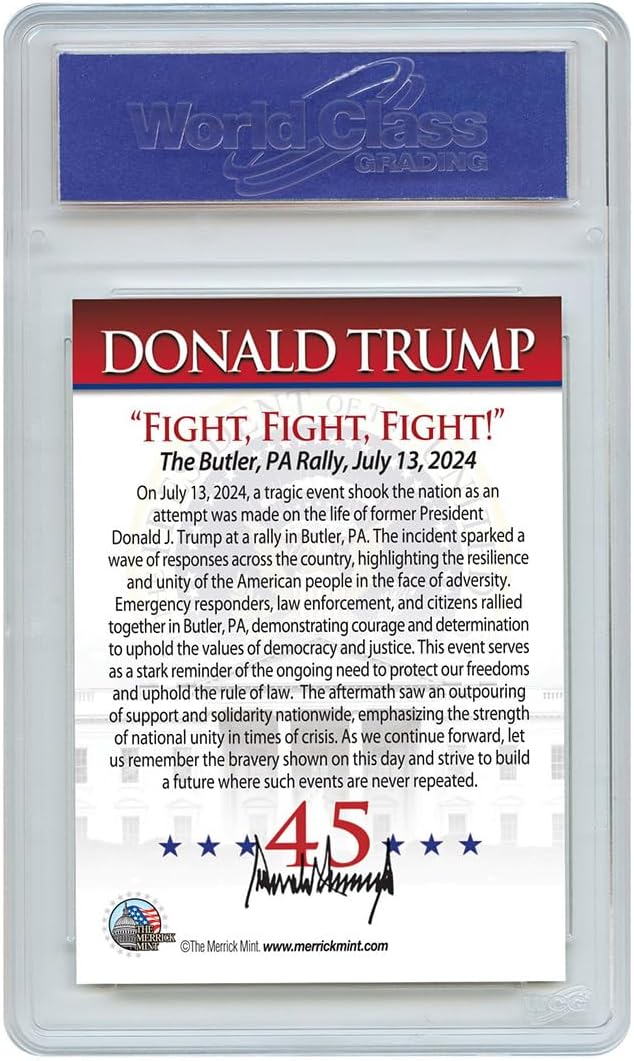 COLLECTIBLE STATUS: Limited edition trading card featuring the 47th President of the United States, standing strong against his adversaries.
