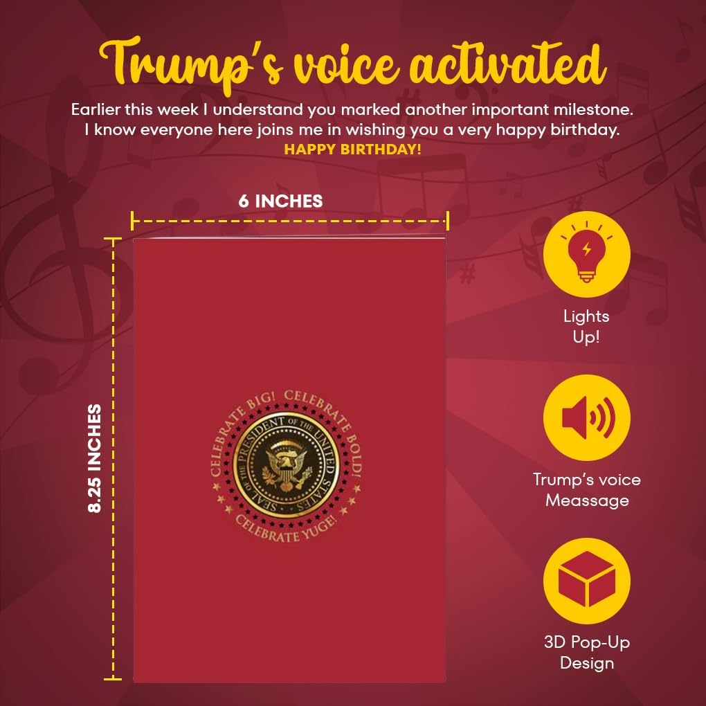 MAKE BIRTHDAY’S GREAT – talking trump pop up birthday card is one of the best birthday gifts for men and women which gives a lot of fun with light up candle and sound. Make your beloved one’s birthday great with Donald Trump’s best, most beautiful birthday message and cheering background music. One of the best holiday gifts to create laughter and fun for friends & relatives.