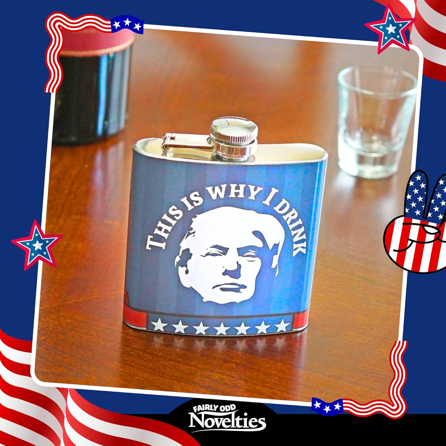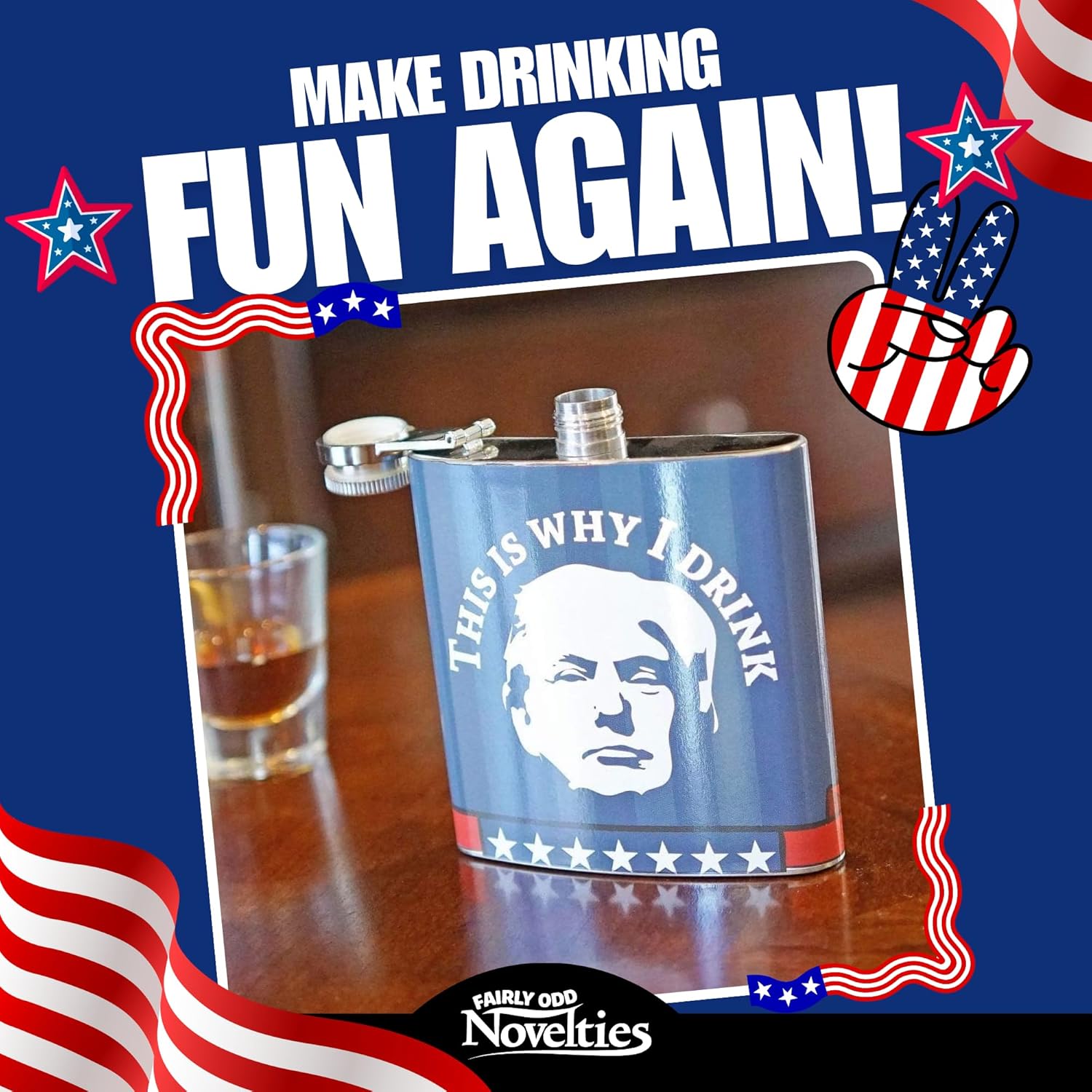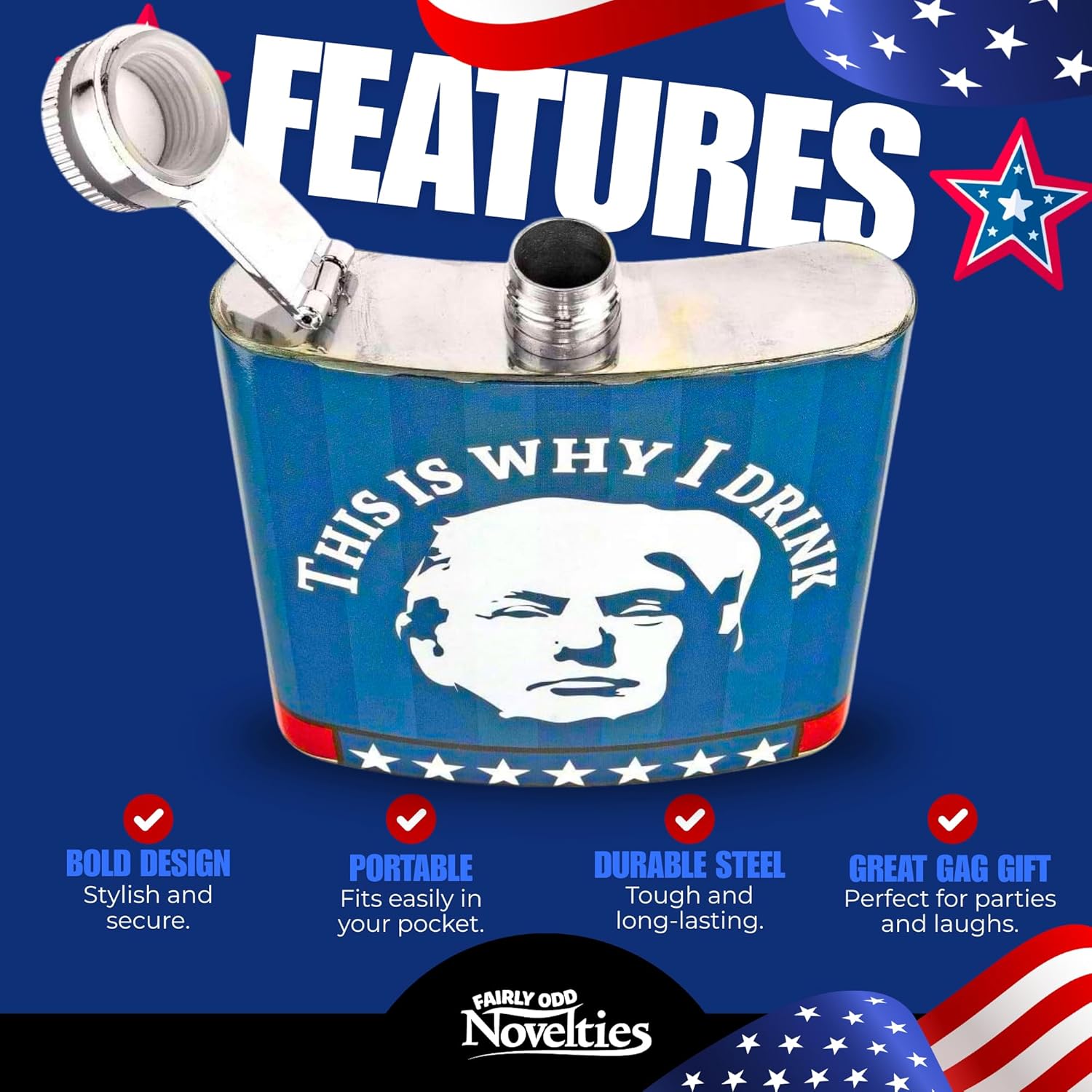 Make drinking great again with the TrumpedUp flask from Fairly Odd Novelties! This is the perfect way to carry around your personal Trump sentiment in a way that anyone can understand. . . Hard Liquor! Proudly display to the world The real reason you drink, and hopefully get some YUUUUGE laughs in the process! While this flask is definitely more of a statement than any old t-shirt or sticker, browse our entire line of TrumpedUp Novelties to fully appreciate our hilarious Trump gag gift offerings and find the perfect compliment to your coping juice. Order your flask today and enjoy the laughs, the sips, and the tears on Trumpet mug (on your flask), giving you a reminder of what’s really going on in our world. Give this flask As a gift and make Mexico- I mean, your friends- pay for it! Flask is made of stainless steel. Holds 6 us fluid ounces. Overall dimensions are 3. 60″ X 4. 35″ X 4. 35″.