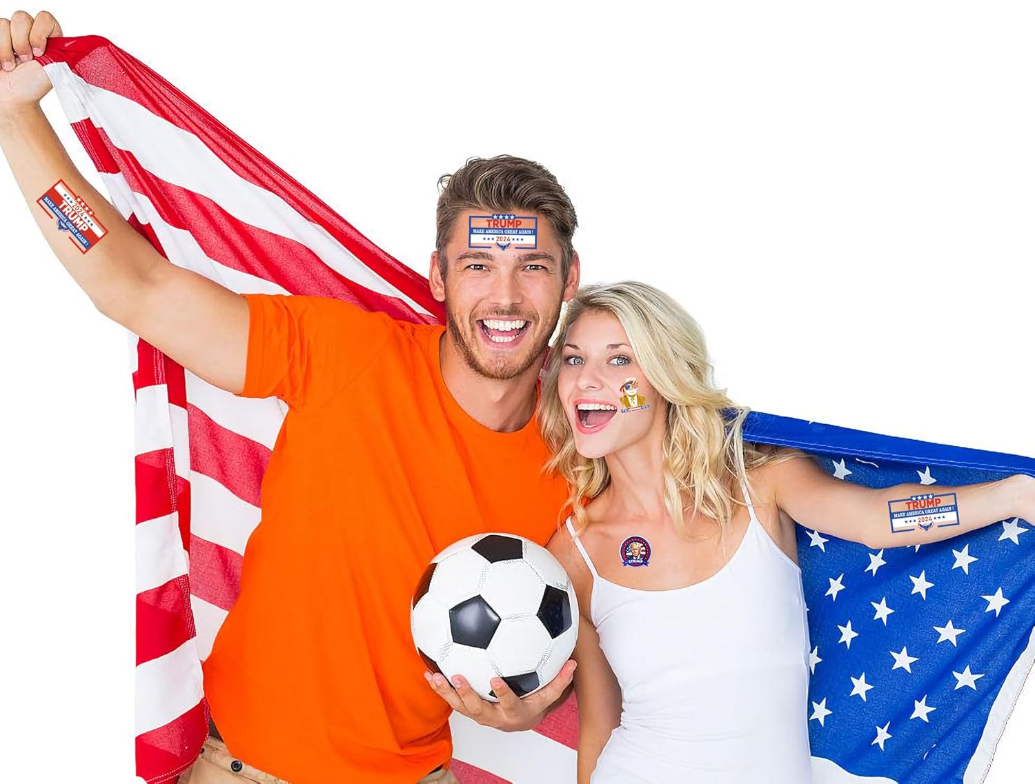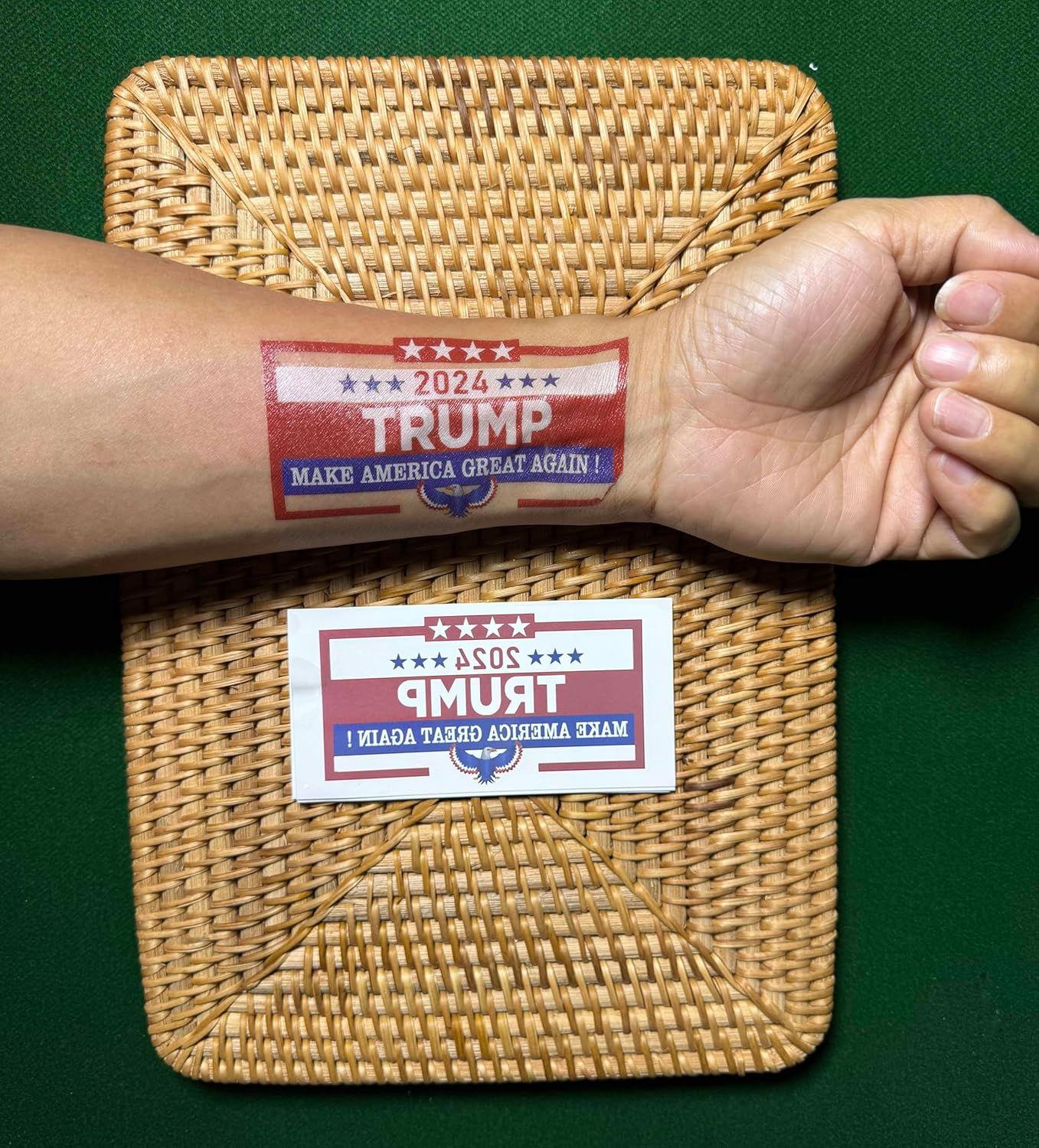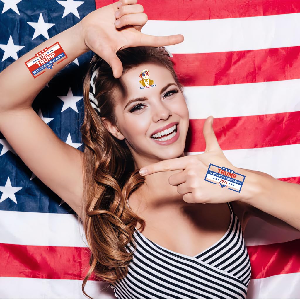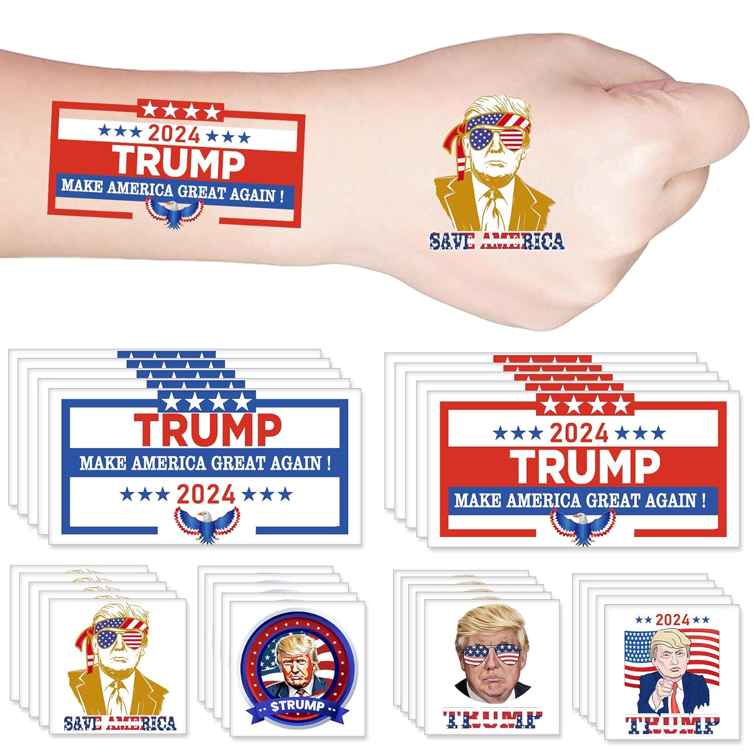 Product Package: 6 styles of Donald Trump 2024 temporary tattoos, 5 sheets of each style, 30 sheets in total.